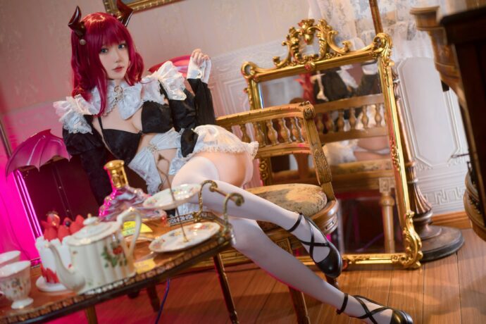 在这组华丽的cos作品中,Coser阿包也是兔娘完美演绎了《崩坏3》中的人气角色 - 莉莉娅·阿琳。作为游戏里可可利亚孤儿院的孩子之一,莉莉娅的设定本就自带一份神秘与危险,而兔娘小姐的演绎更是为这个角色增添了几分性感与魅惑。红发配上深邃的眼神,犄角与蕾丝相互映衬,瞬间把莉莉娅“暗夜之子的”气质拿捏得死死的。