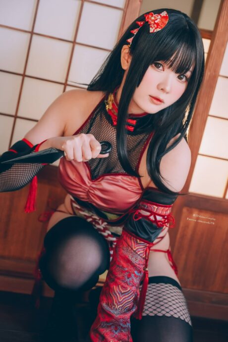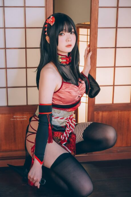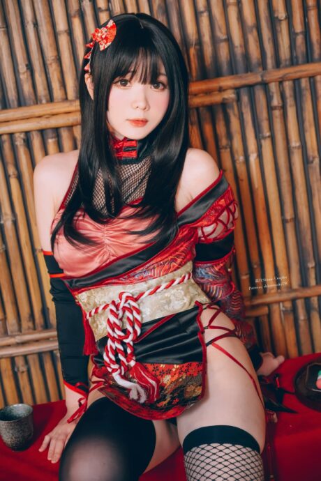 霜月shimo性感忍者cos的服装细节堪称惊艳 - 从红色锦缎的花纹,到腰间交织的绳结,再到腿部复杂的鱼网袜设计,每一处都体现出霜月shimo对造型层次感与质感的精准掌控。她将“忍者”的神秘与“性感”的张力完美结合,不仅展现出角色的危险魅力,也传递出一种独特的自信与力量感。背景采用日式榻榻米房间布景,木质与纸门的柔光反射出她的肌肤光泽,为整组照片增添了浓厚的东方氛围。