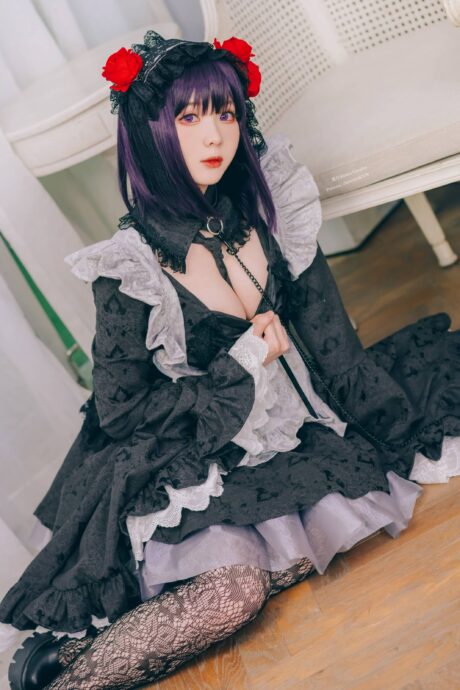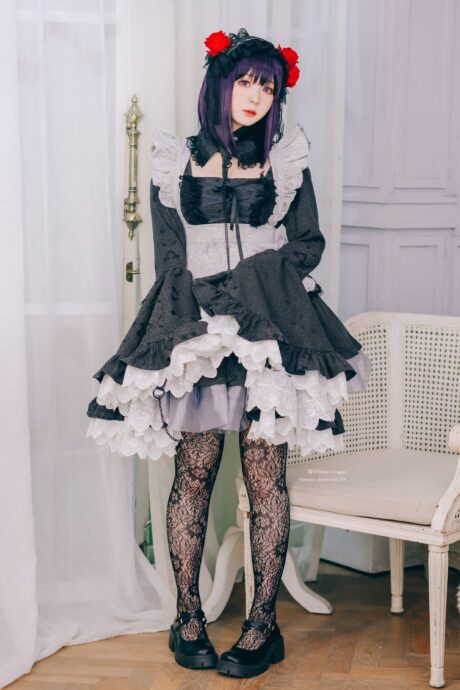 作为一名经验丰富的Coser,霜月shimo的表现力一如既往地出色。她对喜多川海梦对Cosplay热爱的理解,让这次“黑江雫”版本更具层次感 - 不仅仅是外表的装扮,更像是一场内心世界的投射。黑色长裙的优雅、网纹丝袜的魅惑、微微低垂的眼神,每一个细节都在诉说:“这就是海梦心中的完美角色”。在霜月shimo的演绎下,《更衣人偶坠入爱河》的世界被赋予了新的浪漫色彩,也再次证明了她在Cos圈中不可忽视的艺术表现力。