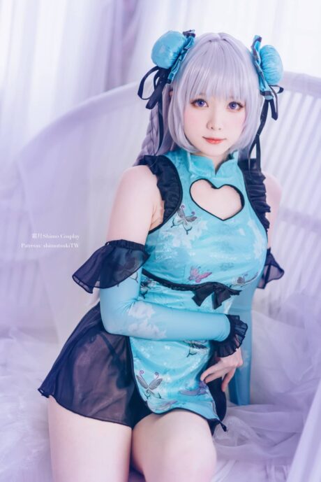 在霜月shimo的黛玉cos中,她所穿的服装以淡蓝与黑色为主调,清冷中透着一抹神秘的妩媚。胸前的心形镂空设计增添了一份俏皮感,蝴蝶刺绣象征着自由与灵魂的飞舞,而轻纱质感的裙摆与流苏细节则完美呼应了黛玉“梦中之花”的形象。她的银灰色长发搭配双丸子发饰,宛如从古典梦境中走出的仙子,轻盈而不失高贵。每一个眼神、每一个姿态,都仿佛在诉说一段朦胧的情感故事。
