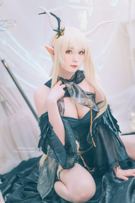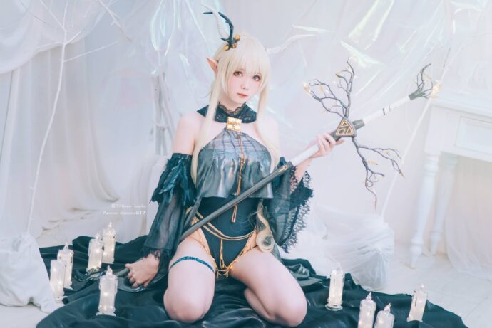 在《明日方舟》中,闪灵不仅是医疗干员中的天花板级存在,更是感染者救助团体“使徒”的一员。她对生命的敬畏与对源石技艺的掌握,使她在战场上宛如黑夜中的灯火,给予同伴最温柔的庇护。霜月shimo在闪灵cos中,白金色的长发柔顺流泻,搭配标志性的恶魔角和精致的耳饰,完美还原了闪灵那“圣洁中带着异域感”的独特气场。她手持法杖,周围点缀着烛光,氛围梦幻又神秘,仿佛下一秒就能释放出净化一切的治愈之光。