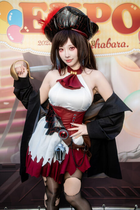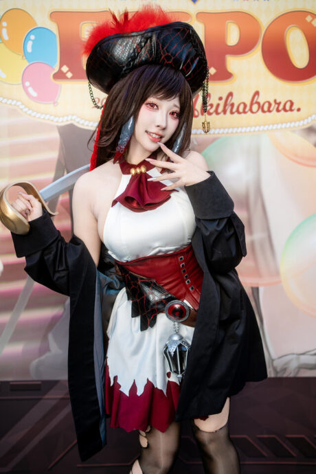 在这组皇家财富号的cos作品中,宮本桜以丝袜与迷你裙的精致造型亮相,完美诠释了“漂亮”与“性感”的平衡。她的装扮融合了海盗元素与时尚感:腰间的饰带、肩头的金边披巾、那顶标志性的海盗帽,都在闪烁着“财富号”的传奇光辉。她那自信又俏皮的笑容,仿佛在诉说 - 只要有风和酒,生活就该这样自由又闪耀。