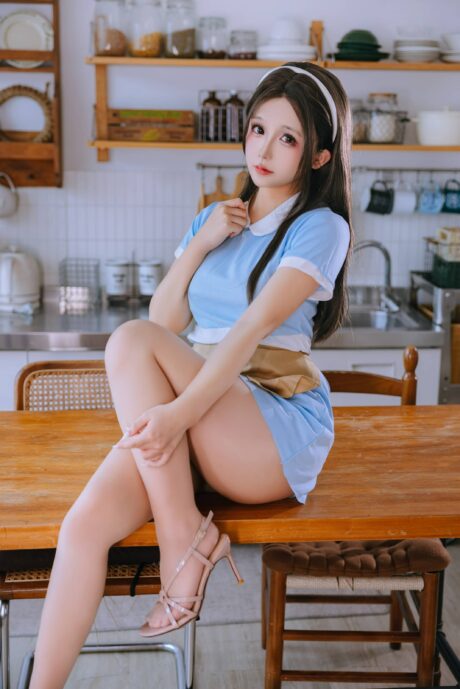 从服装设计来看,Coser日奈娇选择了清新的蓝色连衣裙,搭配温柔的米色围裙,整个造型既展现了甜美的气质,又充满了生活的气息。蓝色是温柔与清新的象征,恰到好处地营造了轻松愉快的氛围,而米色围裙的选择又增添了几分职业感,仿佛她真的就站在蛋糕店后面,微笑着为顾客挑选美味的甜点。这一服装既符合日常生活场景,又为角色增添了不少生动的魅力。
