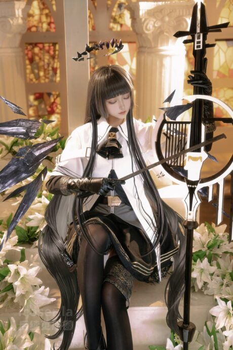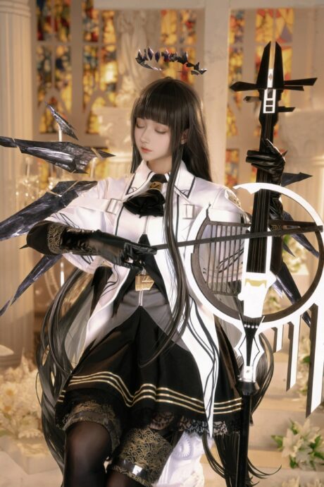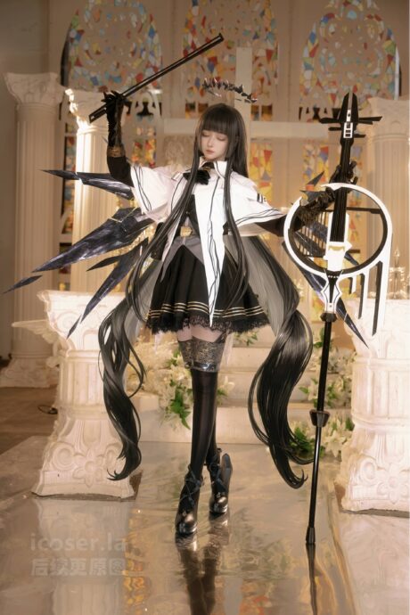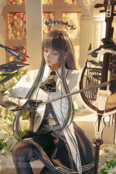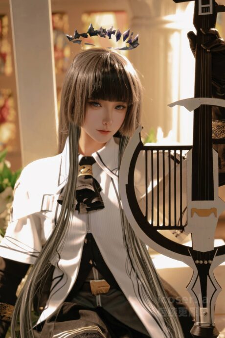 在羽生三未的阿尔图罗cos中,她完美捕捉了角色的气质:冷静、沉静、带着一点独属于音乐家的疏离感。她微闭着眼,仿佛沉浸在自己的旋律世界中,宛如在演奏《焚风》或某个能震动整个莱塔尼亚宫廷的曲目。更绝的是,那把源石风格的“弦乐器”还原度极高,机械线条搭配神秘纹路,既有科技感又具宗教艺术氛围,与阿尔图罗作为拉特兰流浪音乐家的身份完全契合。