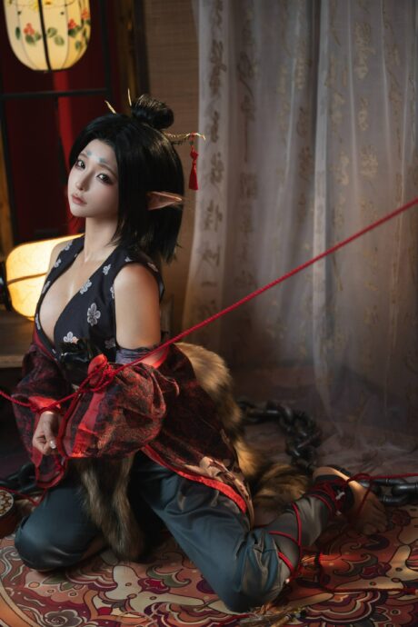 在黑神话萍萍的cos中,蠢沫沫以深色花纹服饰搭配红黑渐变外袍,既保留了妖族少女的异域风韵,又展现出温柔妩媚的感觉。她微微抬眸的神态,带着一点倔强、一点灵气,还有一点“你最好不要靠太近”的若隐若现气场。再加上红色绳结、毛尾装饰与柔和灯光的点缀,让整套造型充满故事感,仿佛正置身于火焰山密室中,被卷入了一场妖族秘事。